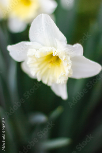 Fototapeta premium White daffodils close-up on a bright sunny day on green background. Pictures of white flowers close up. White narcissus on green bokeh background