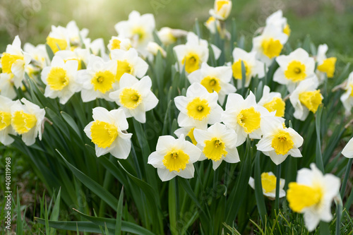 Fototapeta premium White daffodils in a flower garden in spring. Selective focus.