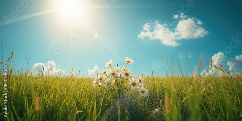 © The 2R Artificiality, Naklejka premium White daisies under a clear blue sky with sunlight, suitable for garden or outdoor scene design