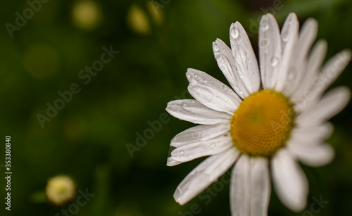 © Екатерина Шелудько, Obraz premium white daisies with water drops close up in green grass and blurred background