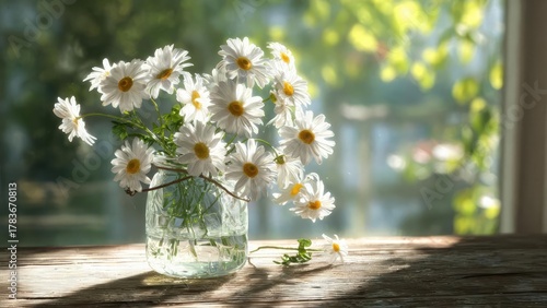 Fototapeta premium White daisies with yellow centers arranged in a glass jar on a sunlit wooden...