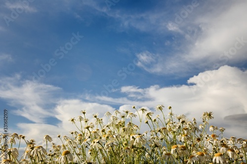 © makam1969, Obraz premium white daisy field under a blue sky with clouds