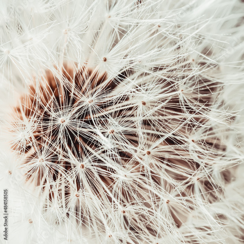 Obraz premium White dandelion head with seeds macro. Selective soft focus. Natural background