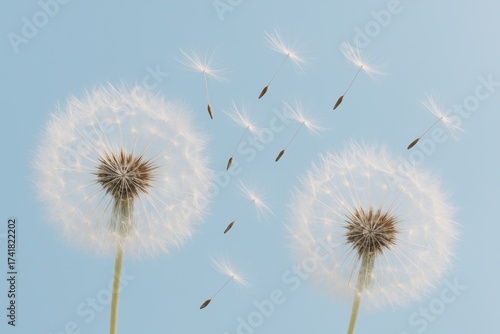 Obraz premium White dandelion seeds drifting across sky blue background with airy minimal...