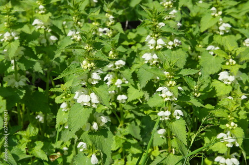 Obraz premium White dead-nettle (lat. Lamium album) blooms in the meadow
