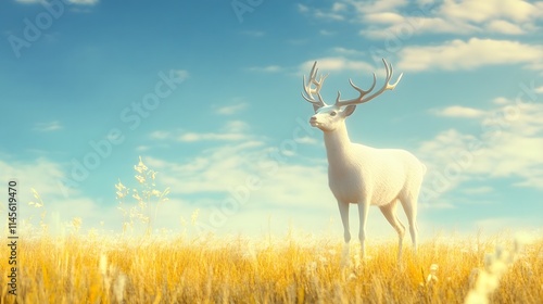 Fototapeta premium White Deer Stands in Golden Grassland Under Blue Sky