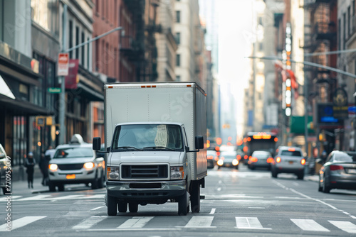 © Татьяна Евдокимова, Obraz premium White delivery truck parked on a bustling city street during daytime