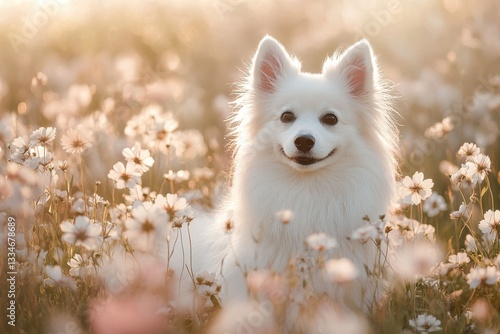 © Anha, Fototapeta premium White dog in a field of flowers golden hour sunlight
