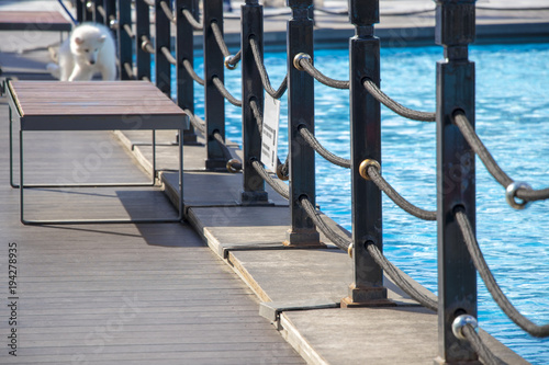 © Onuro, Naklejka premium white dog, wood floor, rope, blue water pool