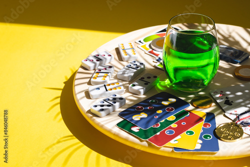 Fototapeta premium White dominoes, playing cards, uno, ligretto and a green drink on a yellow...
