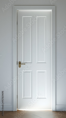 © Rysak, Fototapeta premium White Door Open To Reveal Light and A Wooden Floor