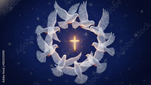 Fototapeta premium White dove circle around a glowing Christian cross on a dark blue background with stars, representing peace and faith for Christian holiday or teaching material.
