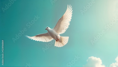 © Vadym, Obraz premium White dove flies freely in light turquoise sky. Beautiful bird peace, hope. Natural scene. Spiritual imagery. Perfect design element for faith-based projects. Ideal for uplifting projects. Evokes