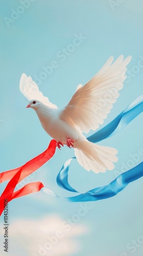 Obraz premium White dove flying with flowing blue and red ribbons against a bright sky