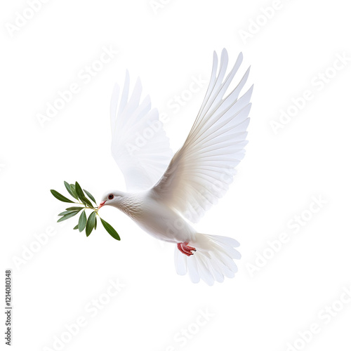 Obraz premium white dove flying with green olive twig isolated on transparent background