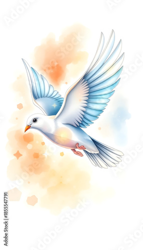 © Elmir, Obraz premium White dove flying with wings spread against soft watercolor background