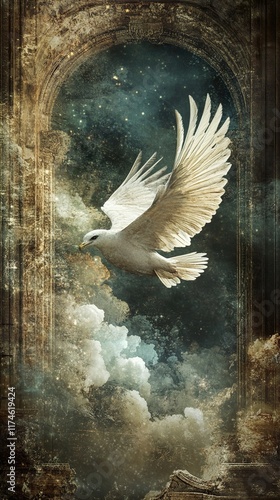 © Infinity, Obraz premium White Dove in Flight: A Mystical Journey Through Ancient Ruins