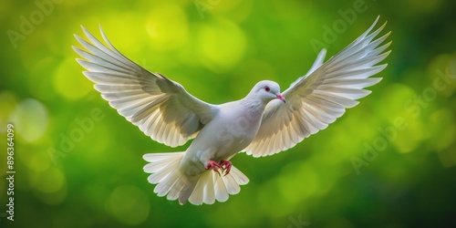 Obraz premium White Dove in Flight with Green Bokeh Background, dove, bird, nature , peace