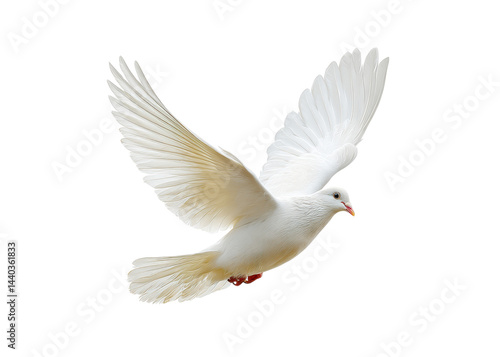 © Sariyono, Obraz premium White Dove in Flight with Outstretched Wings Against a Clean Black Background