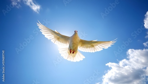 © Vision Grid, Naklejka premium White Dove Soaring Through a Bright Blue Sky with Clouds