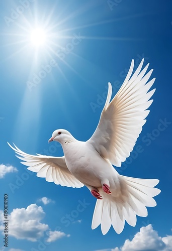Fototapeta premium White Dove Soaring Through A Sunny Blue Sky