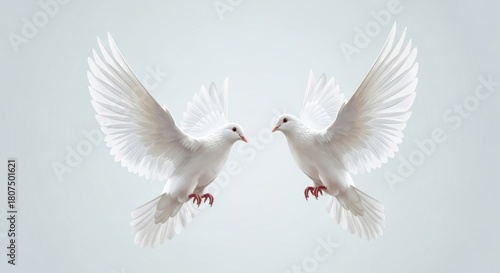 © Farhan, Fototapeta premium White Doves Flying Towards Each Other on Grey Background