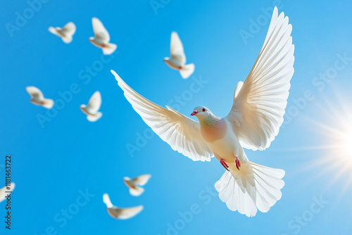 © Yana Zolotova, Obraz premium White doves flying under bright blue sky.