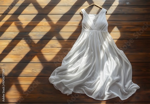 © TigerDude, Obraz premium White dress on a wooden background, flat lay. High-resolution, photorealistic image.