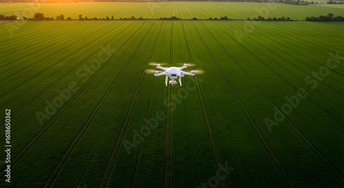 © Alfitra, Obraz premium White drone flying over a large green field with rows of crops, trees in the background, and a warm sunset sky.