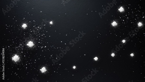 Fototapeta premium White dust particles and grain texture overlay on a black space background. Abstract design.