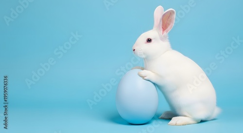 Obraz premium White easter bunny with blue egg on light blue background