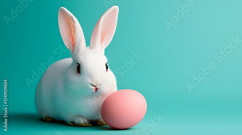 Obraz premium White Easter Bunny with Pink Egg on Teal Background