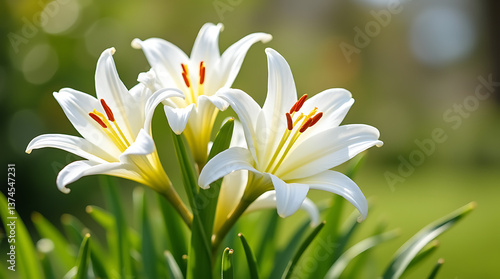 Fototapeta premium White Easter Lilies in Full Bloom Under the Sun in a Lush Garden, Symbolizing...