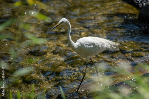 Naklejka premium White eastern great egret (Ardea alba modesta) standing in the shallow waters...