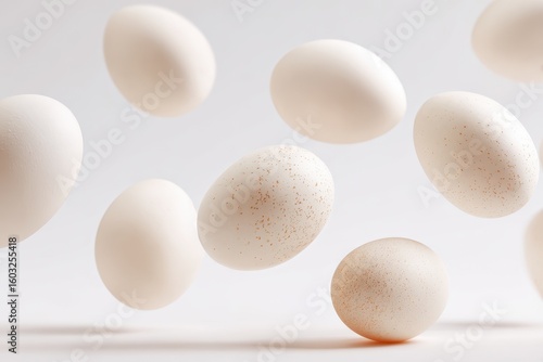 © VolumeThings, Fototapeta premium White eggs float against a white backdrop