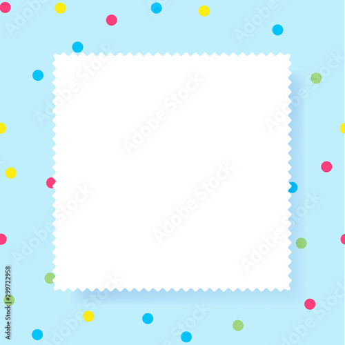 © vectorplus, Fototapeta premium White Empty paper rectangle with copy space for text. Confetti color dots background. Vector illustration