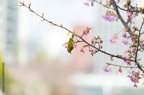 Fototapeta premium white-eye and Kawazu cherry tree