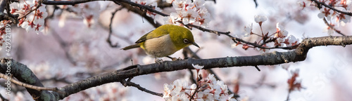 © Iwao, Fototapeta premium White-eyes, the bird is looking under Cherry blossoms trees.