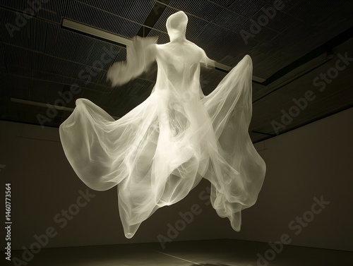 © lareyna, Fototapeta premium white fabric sculpture, dynamic form, dark background, flowing lines, artistic installation