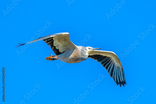© Merrillie, Obraz premium White-faced heron flying in the blue morning sky