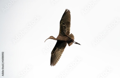 Obraz premium White faced ibis in flight showing iridescent wing colors against a clear sky