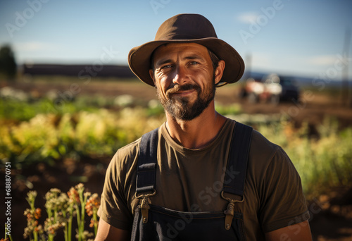 © Larisa AI, Obraz premium White farmer boy enjoying on his farm