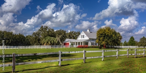 Obraz premium White Farmhouse with a White Fence and Blue Sky