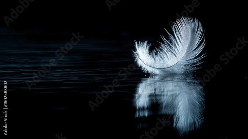 © YONDAIME, Obraz premium White Feather Floating on Dark Water Surface.