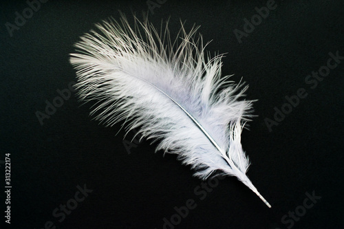© Olivka888, Obraz premium White feather isolated on a black background.