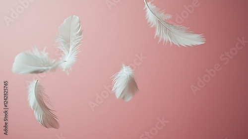 Obraz premium White feathers falling, pink background