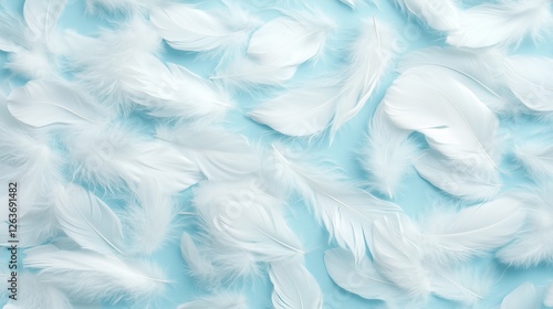 Fototapeta premium White feathers scattered on a light blue background create a soft and serene...