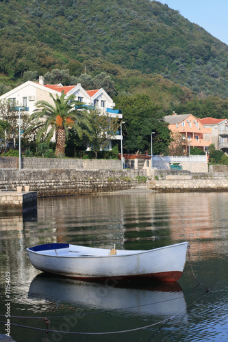 © FomaA, Fototapeta premium White fishing boat near the village Stoliv in Montenegro.
