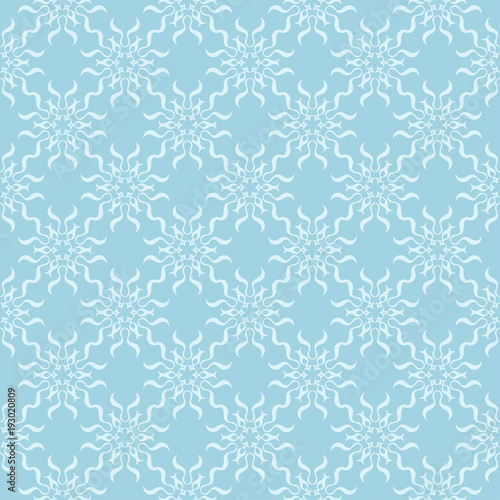© Liudmyla, Fototapeta premium White floral ornament on blue. Seamless pattern