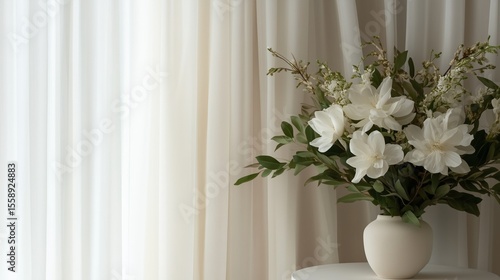 Fototapeta premium White flower arrangement displayed in a vase near a window covered by sheer fabric curtains